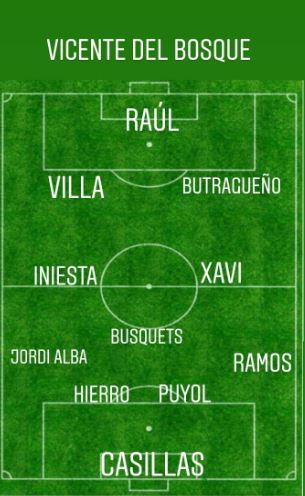 Defensa: Sergio Ramos, Carlos Puyol, Fernando Hierro, Jordi Alba.